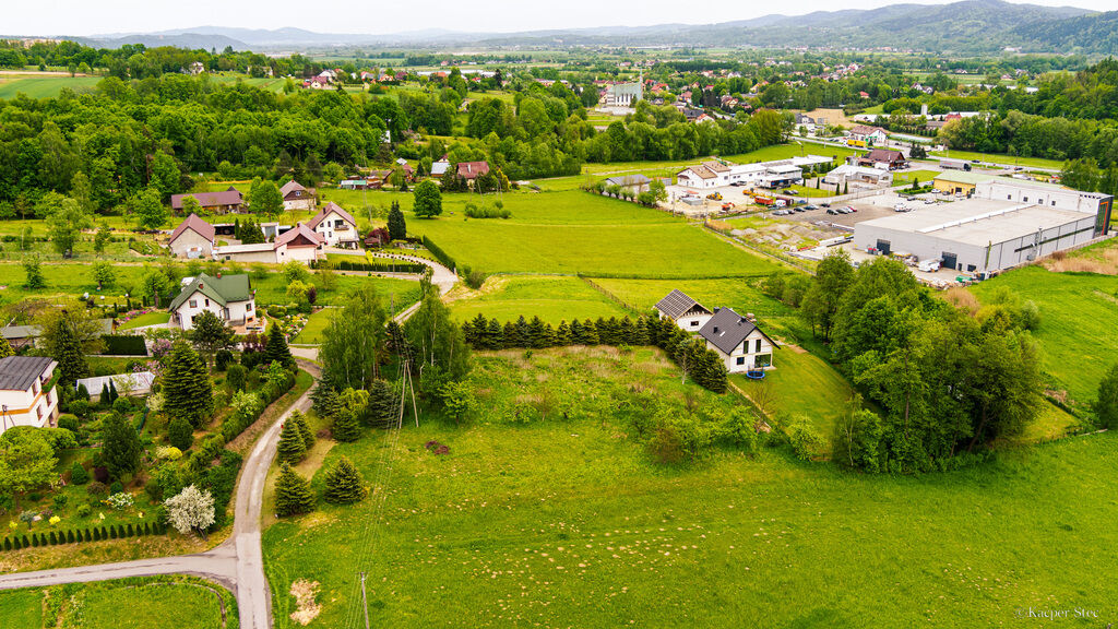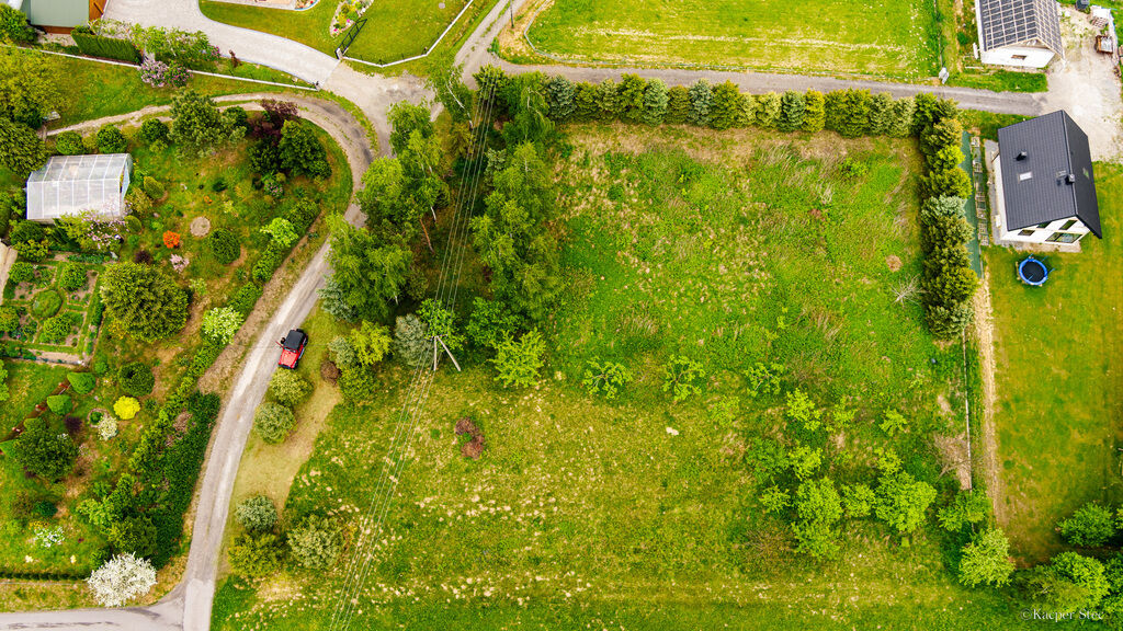 widok na okoliczną zieleń. Działka ma nieregularny kształt, co